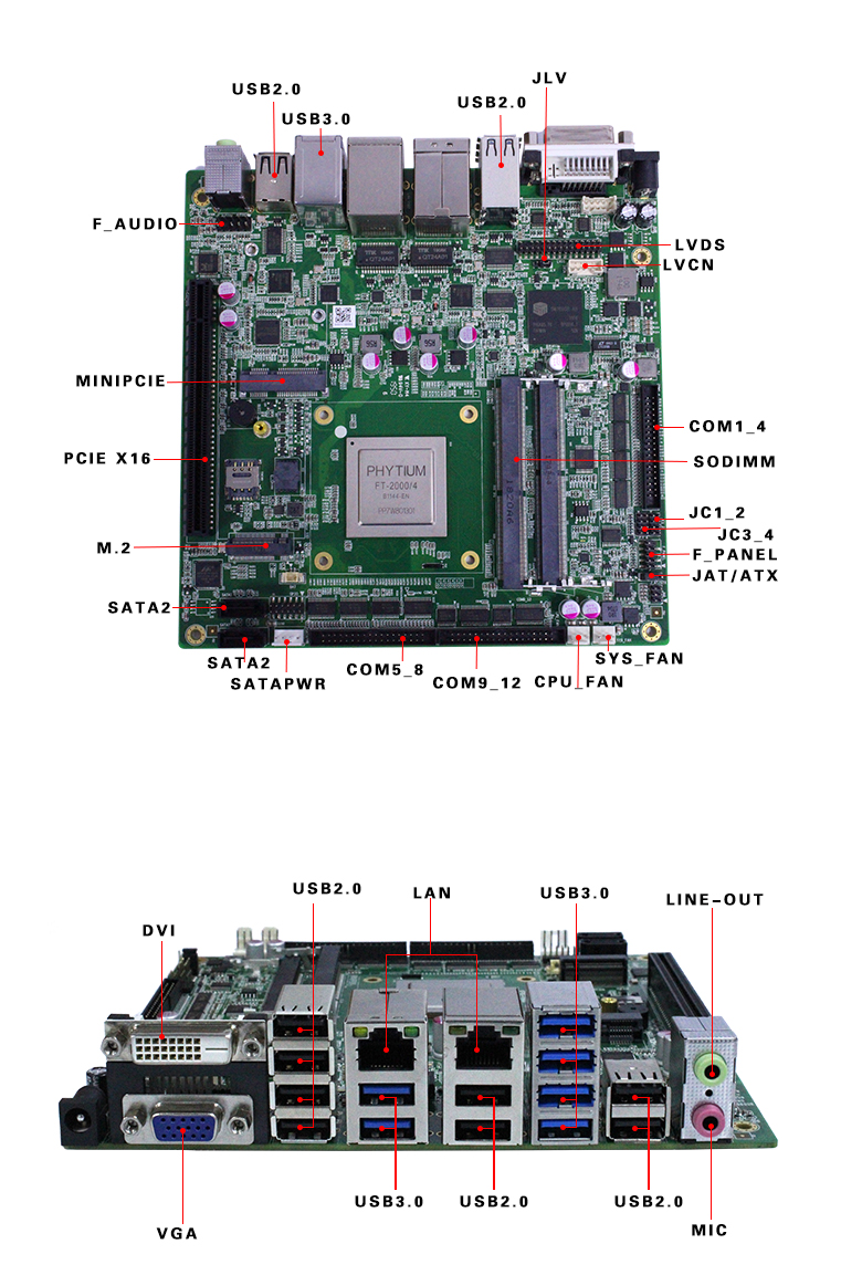 1、采用飛騰FT-2000四核CPU,支持一路VGA、DVI、LVDS;